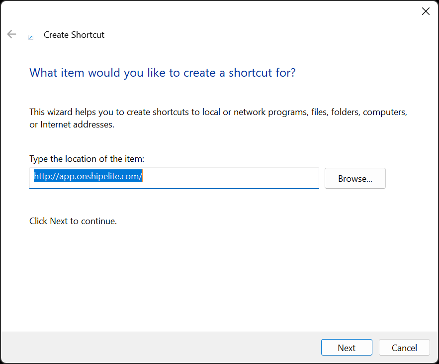 Enter http://app.onshipelite.com/  into the text box then click the "Next" button