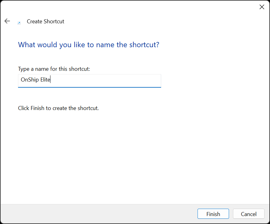 Type the shortcut name OnShip Elite into the text box and click Finish